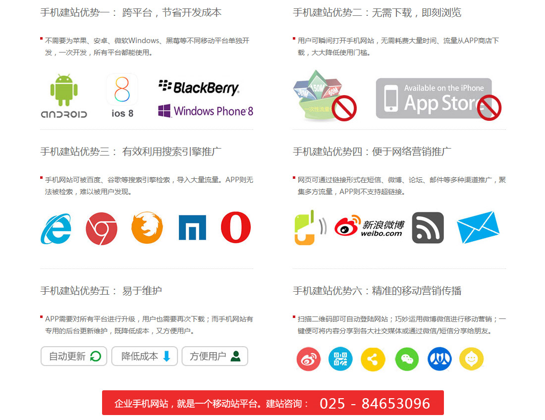 我们使用业界标准HTML5设计手机专用网站,完美支持现行流行的Android(安卓)、Apple(苹果)系统的智能触屏手机。因为手机网站设计都比较简洁,代码也很精少,所以打开速度都很快。