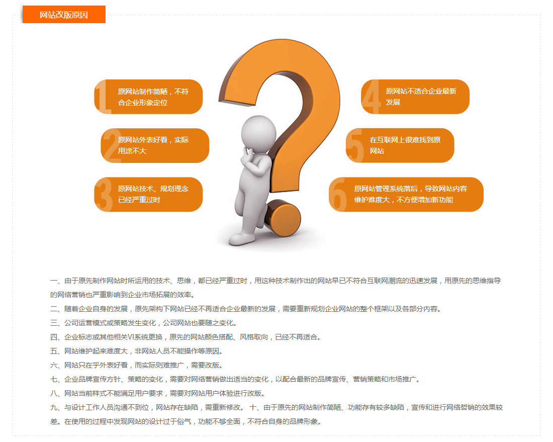 用户第一,网站改版首要考虑的即是网站用户的访问体验,网站没有了用户那么改版就没有意义了,我们既要考虑新访客,又要顾及旧访客。在遵守网页UI的科学要求同时,我们对原网站的各种内容、应用和功能做全面考虑,统筹规划,不因改版让原访客感到无所适从产生抵触心理,又以科学合理的新体验赢得新访客。